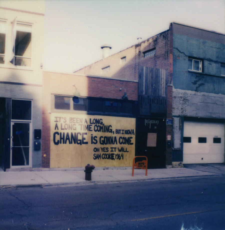 Spent some time cycling the retail corridors of the city and saw some amazing artwork painted on people’s boarded up windows. This Sam Cooke lyric really stuck with me though.