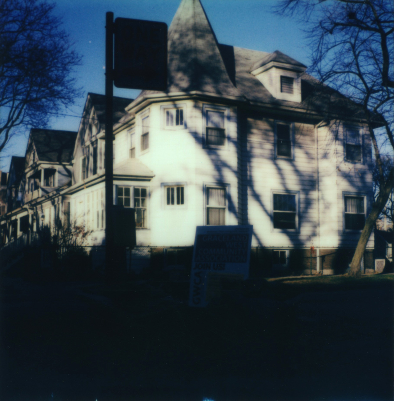 We had a beautiful breezy day here in the city and I shot this photo while walking the dog. You can barely see it, but below the sign there are a number of leaf collection bags that Graceland West Community Association collected. as part of our annual cleanup.