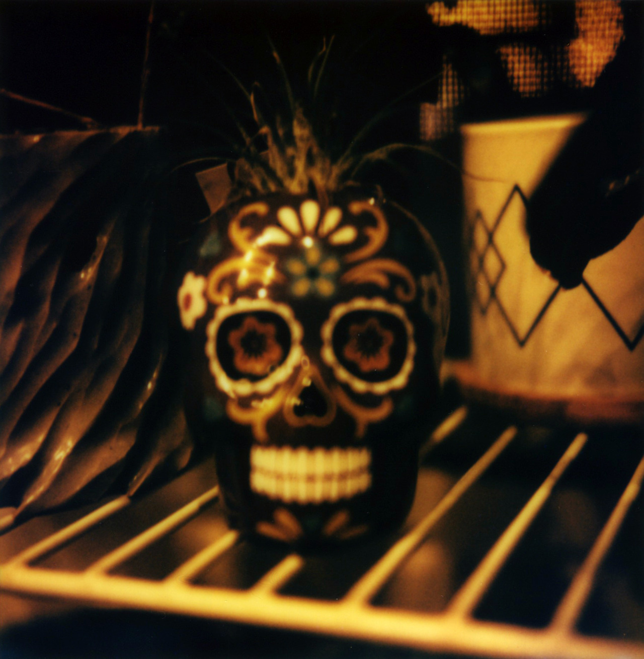 A second pass of trying to photograph the sugar skull planter in the window. This time I overestimated the macro photo abilities of the SLR 680.