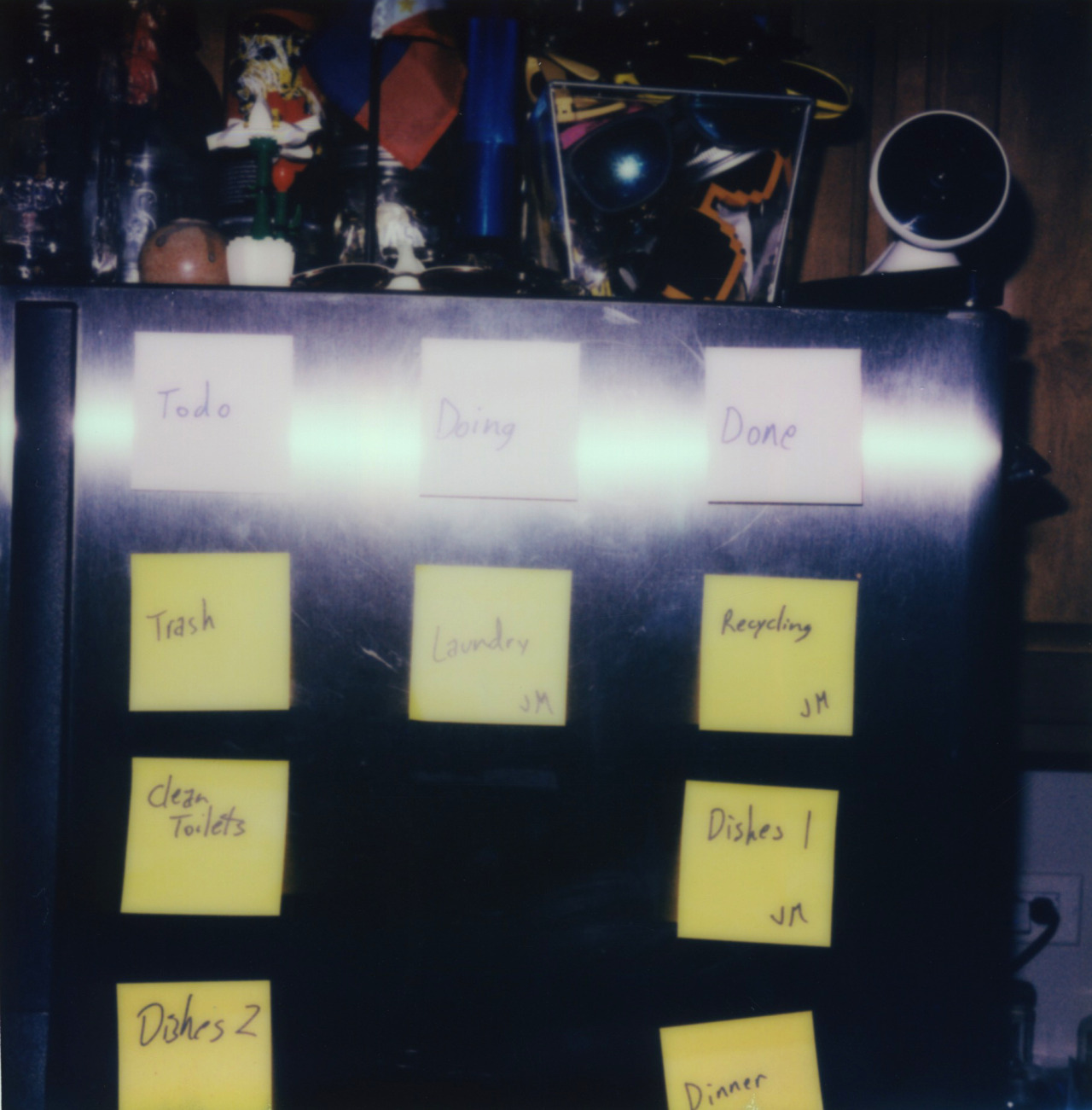 My wife and I are trying a new tactic where we put our chores on the fridge as a kanban with sticky notes. So far, so good.