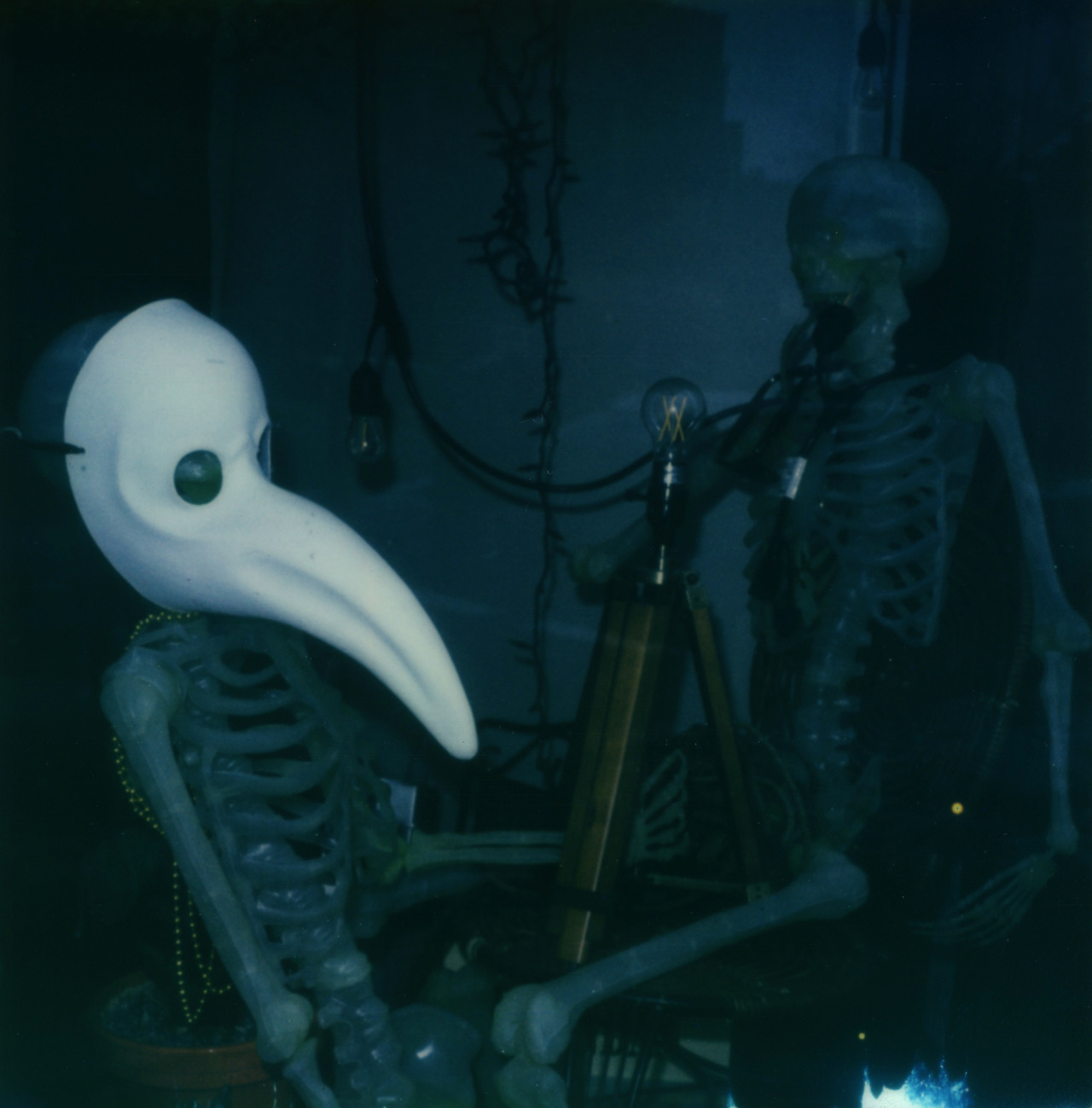 The window of Bombastic Cafe on the southport corridor has a skeleton in a plague mask and another with a lightbulb in its mouth. A delightful amount of weird for a neighborhood not exactly known for being edgy.
